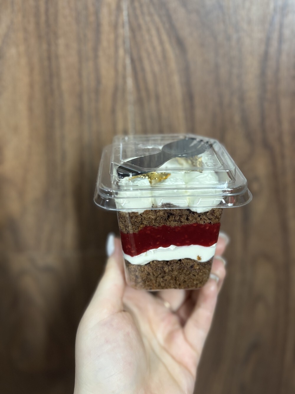 ( шоколадный бисквит, малиновая прослойка , крем сливочный , пищевое золото)